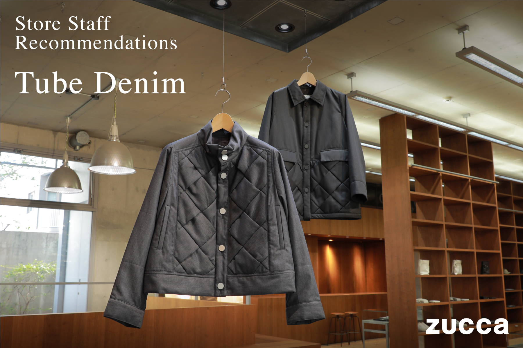 ZUCCa 11月発売「チューブデニム」。短冊状の生地を交互に編み込んだ、立体的なデザインの中綿ジャケットシリーズをぜひご覧ください。