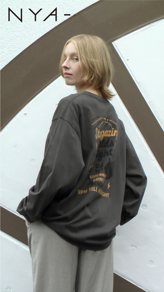 クラブイベントのフライヤーをイメージしたグラフィックを背中にプリントしたロングスリーブTシャツや、