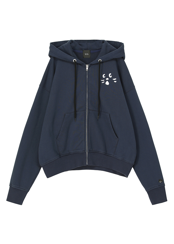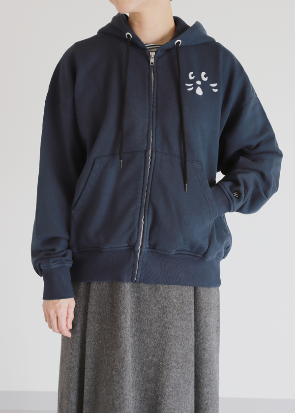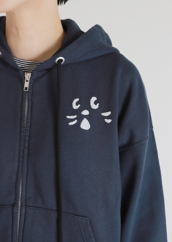 左胸にNYA-の顔パーツをサガラ刺繍で施し、アクセントに。