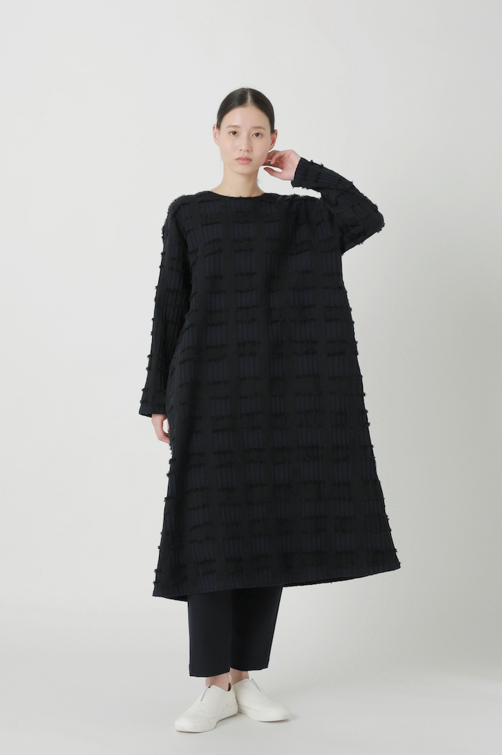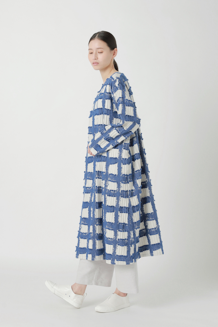 そのベース生地にカットジャガード織機で柄をのせ、仕上げに糸をカットすることで手書き風のチェック柄を表現しました。