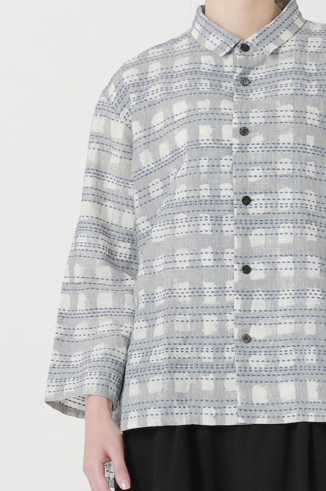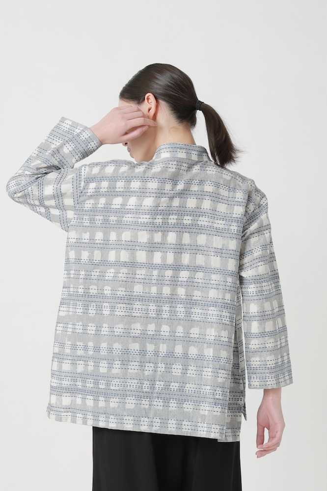 さらに、先染め糸で表現した刺し子ステッチのような織りと、手描き風のライン柄を重ね合わせることで、伝統技法にモダンなニュアンスを添えた、表情豊かな素材です。