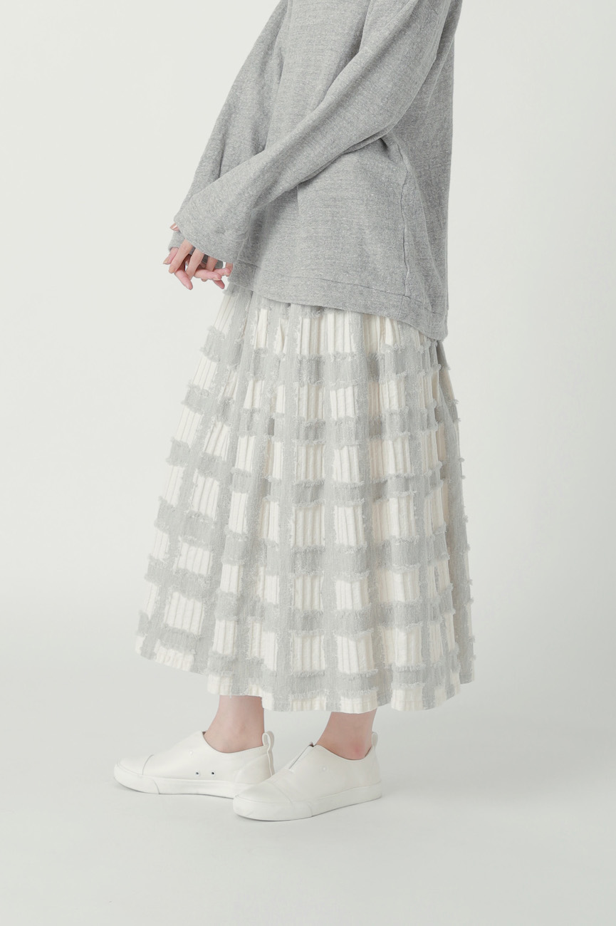 「BIZEN WAVEは、織りの組織や製品加工によって表面に生まれるウェーブ状の凹凸が特徴のテキスタイルです。今回はそのウェーブ組織に、カットジャガードという異なるテクニックを組み合わせ、チェック柄を表現しました。柄部分はカットジャガードなのでフリンジになっているのもポイントです。生地の違い、異なる生地の表情を活かして柄を作る、プランテーションらしい発想の1枚です」(テキスタイル担当)