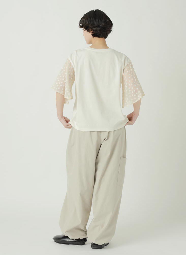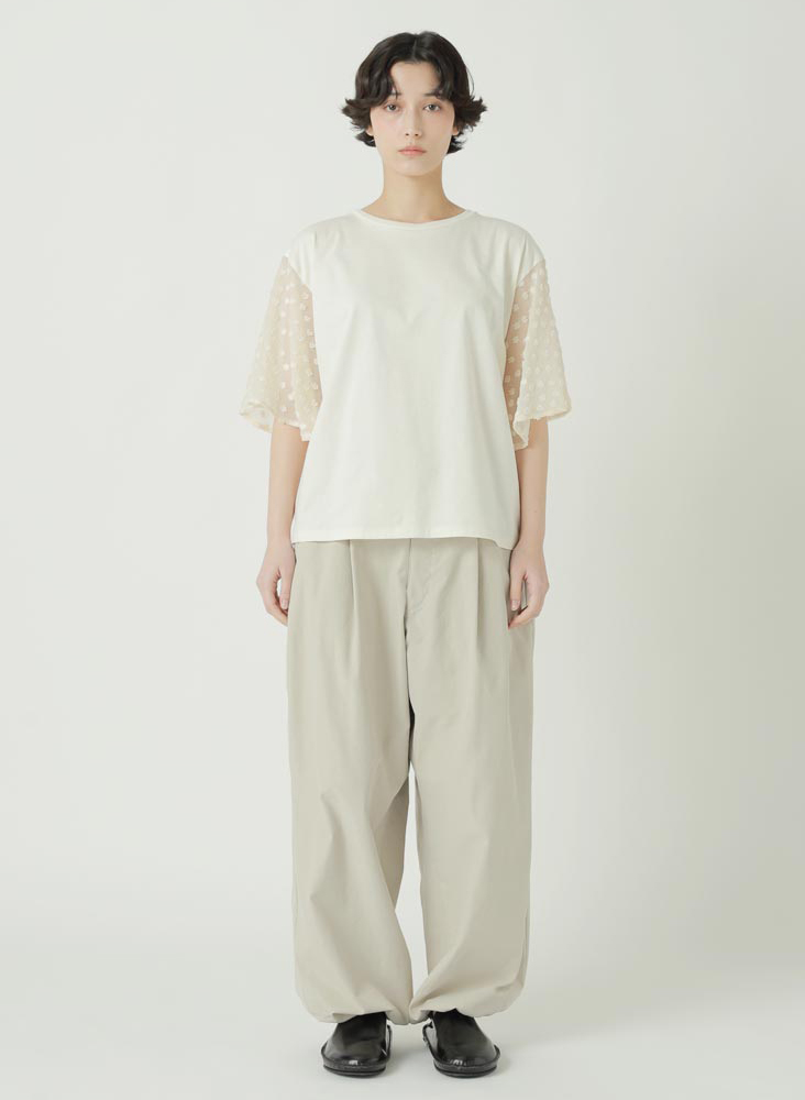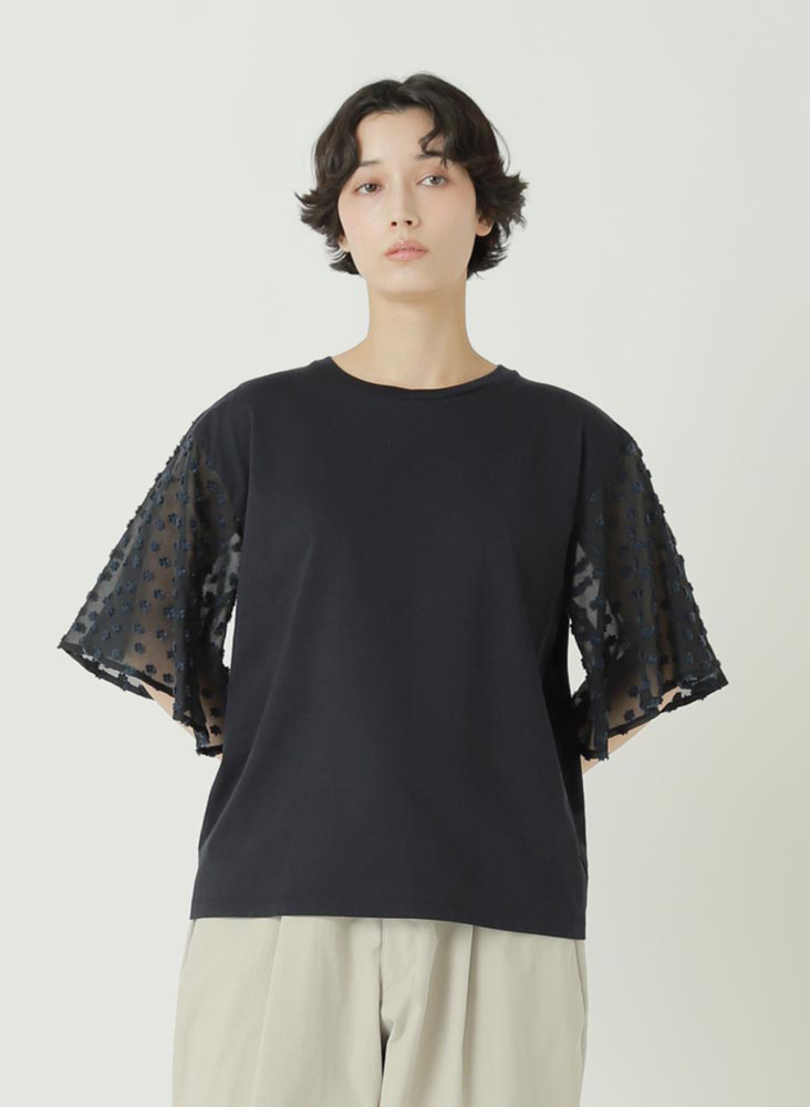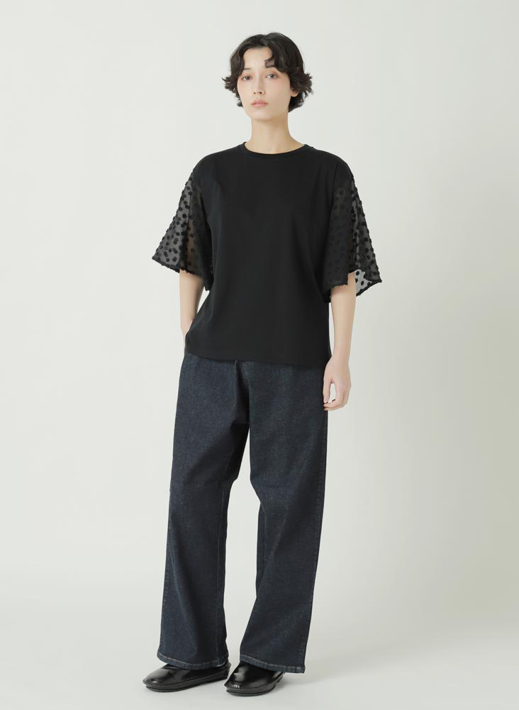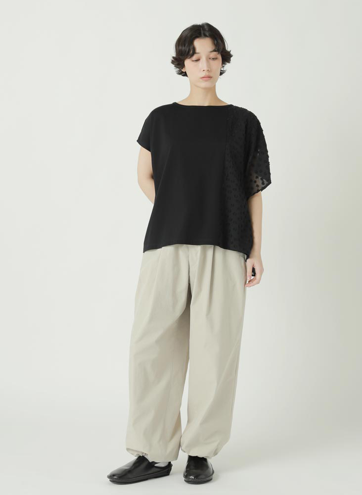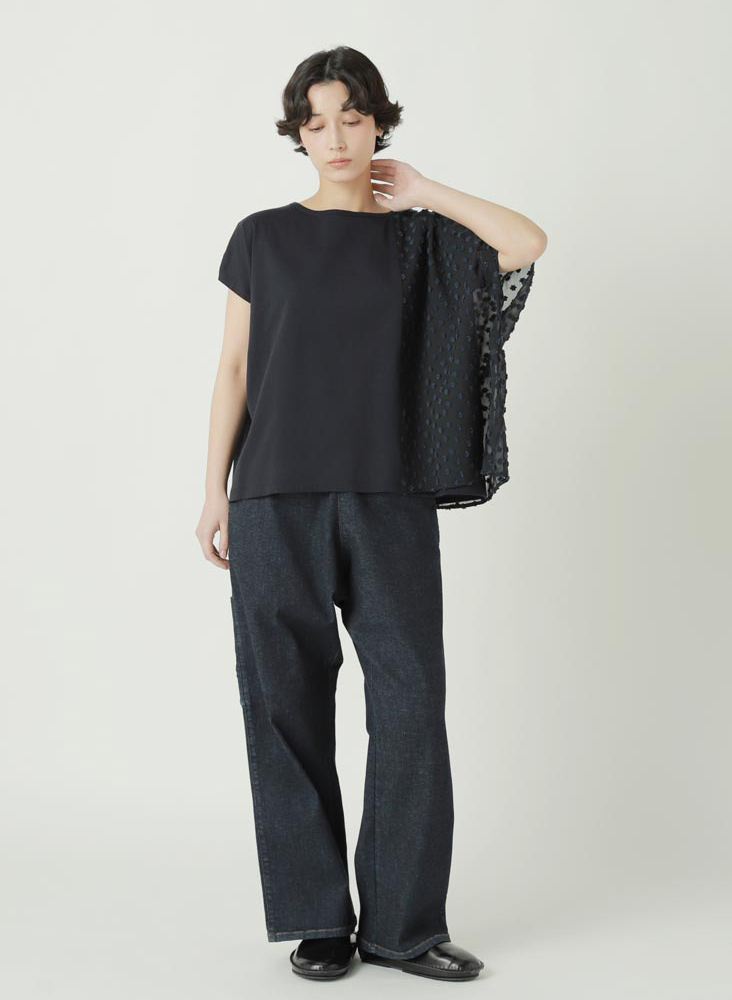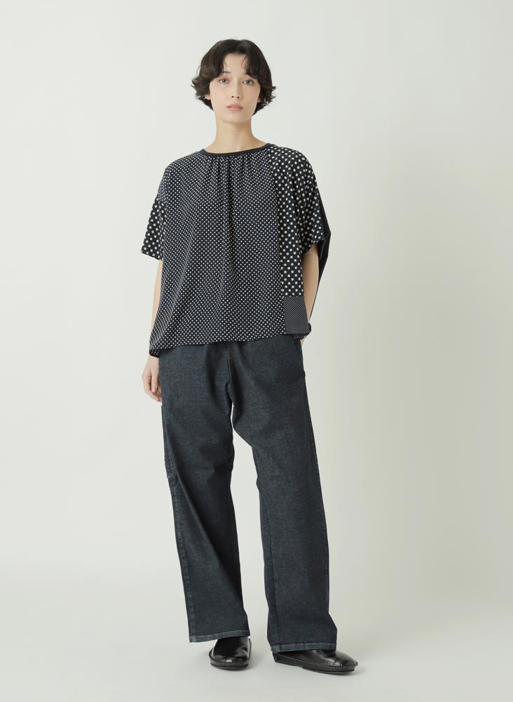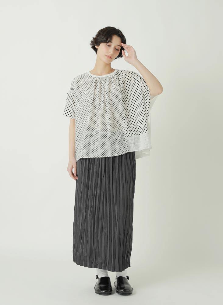 袖にドット柄をドッキングしたカットソー。身頃はすっきりと仕上げることで一枚でさまになるデザインに仕上げました。