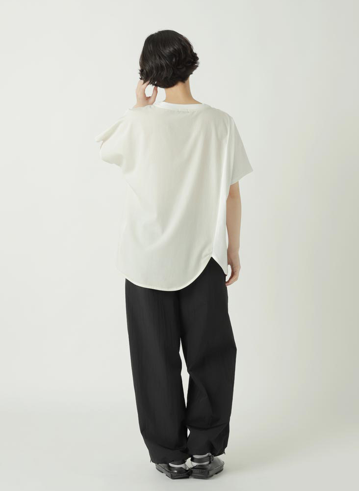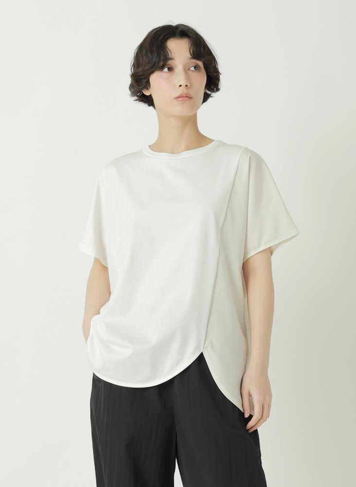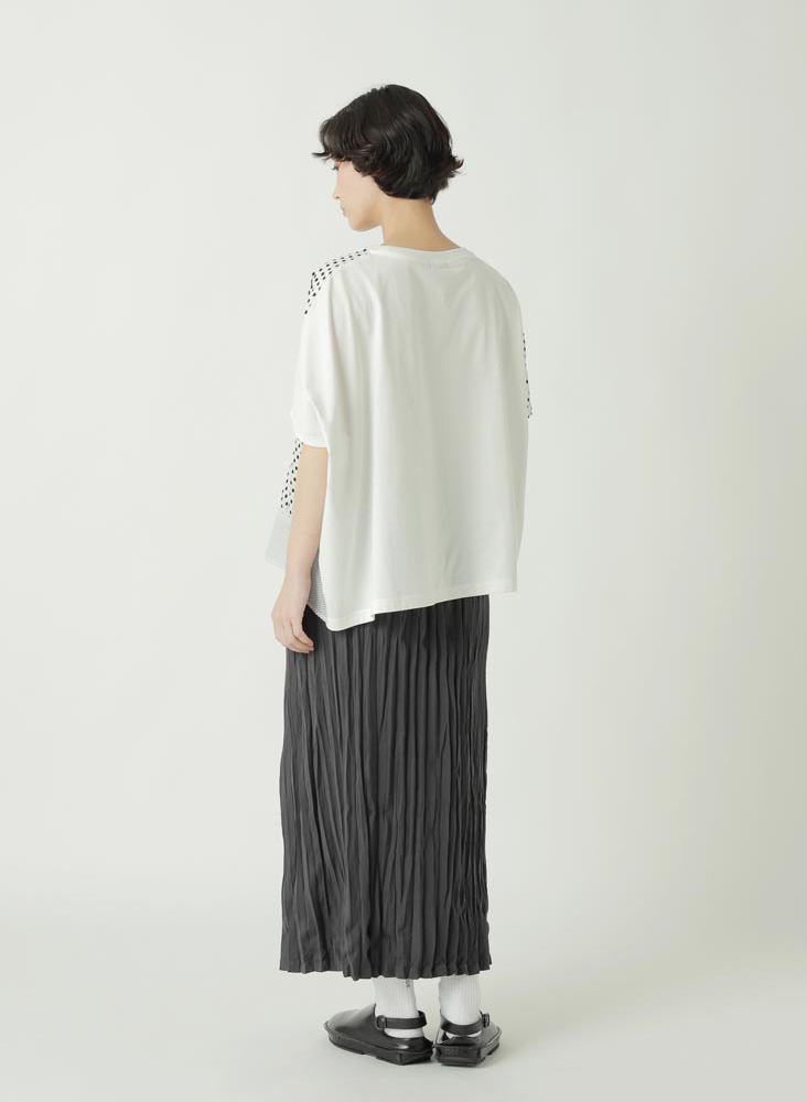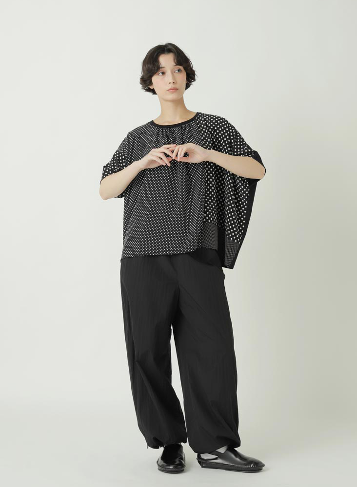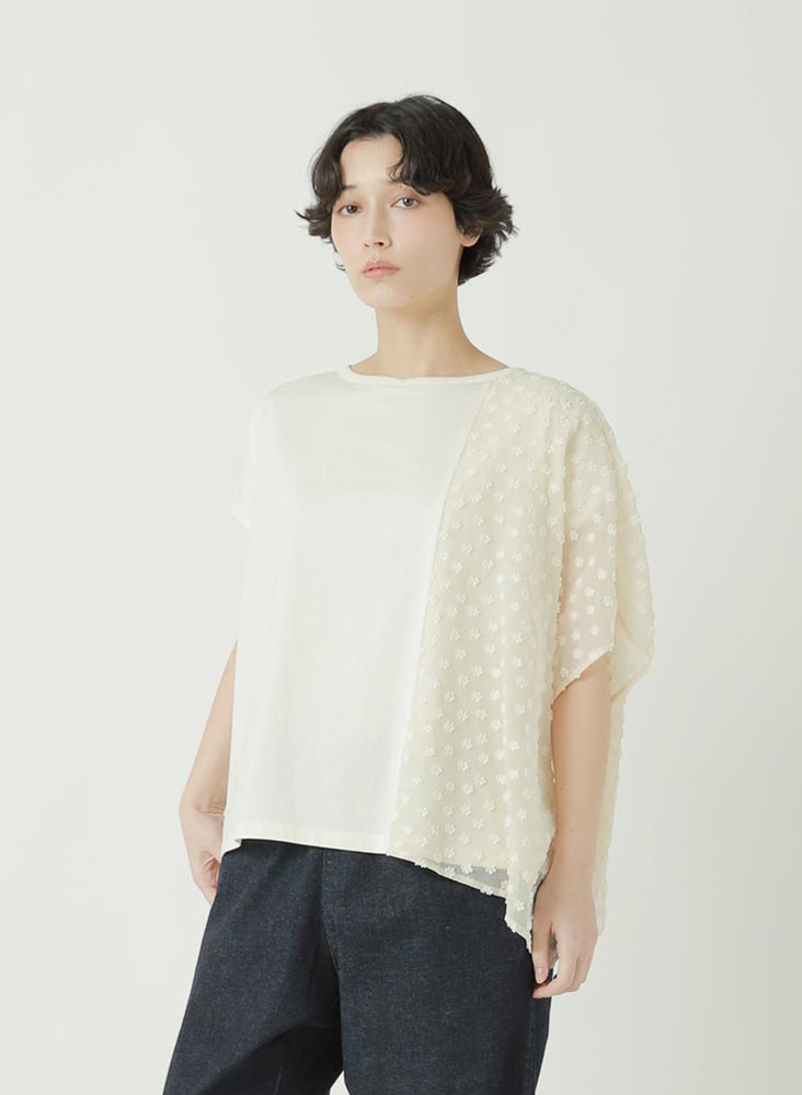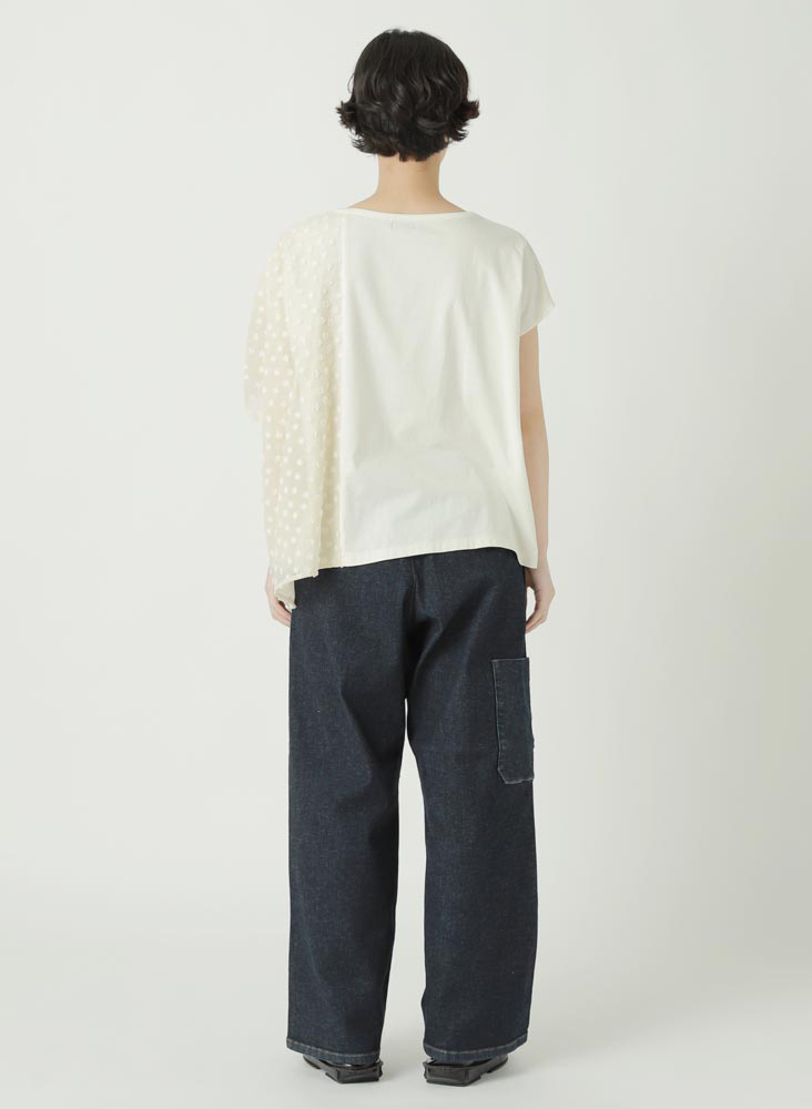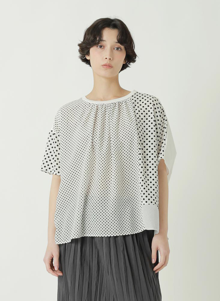 アシンメトリーデザインが特徴のカットソーで、立体感のあるドット柄をドッキングしています。
